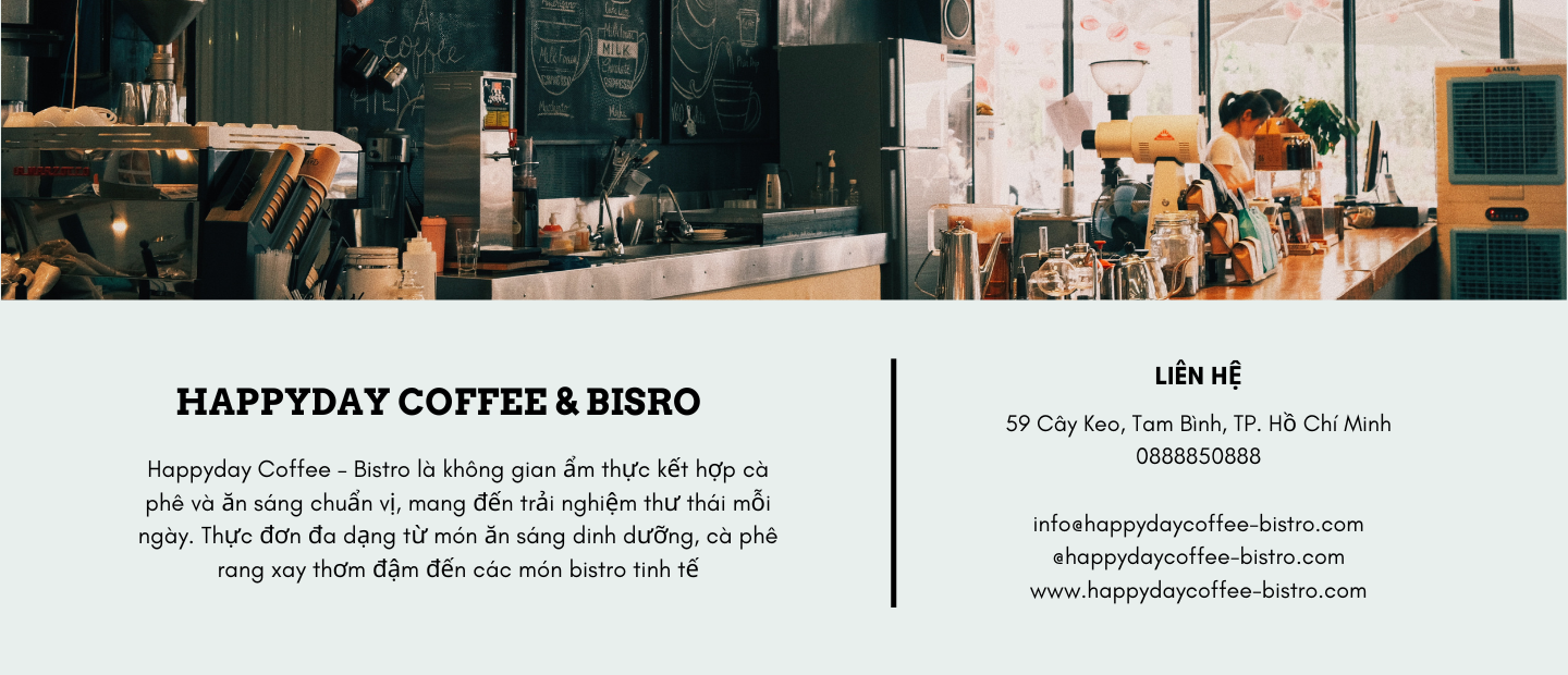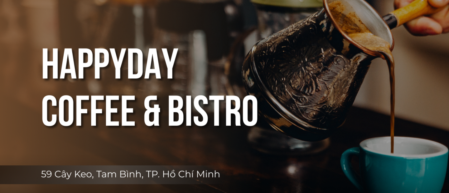 Happyday Coffee – Bistro là không gian ẩm thực kết hợp cà phê và ăn sáng chuẩn vị, mang đến trải nghiệm thư thái mỗi ngày. Thực đơn đa dạng từ món ăn sáng dinh dưỡng, cà phê rang xay thơm đậm đến các món bistro tinh tế